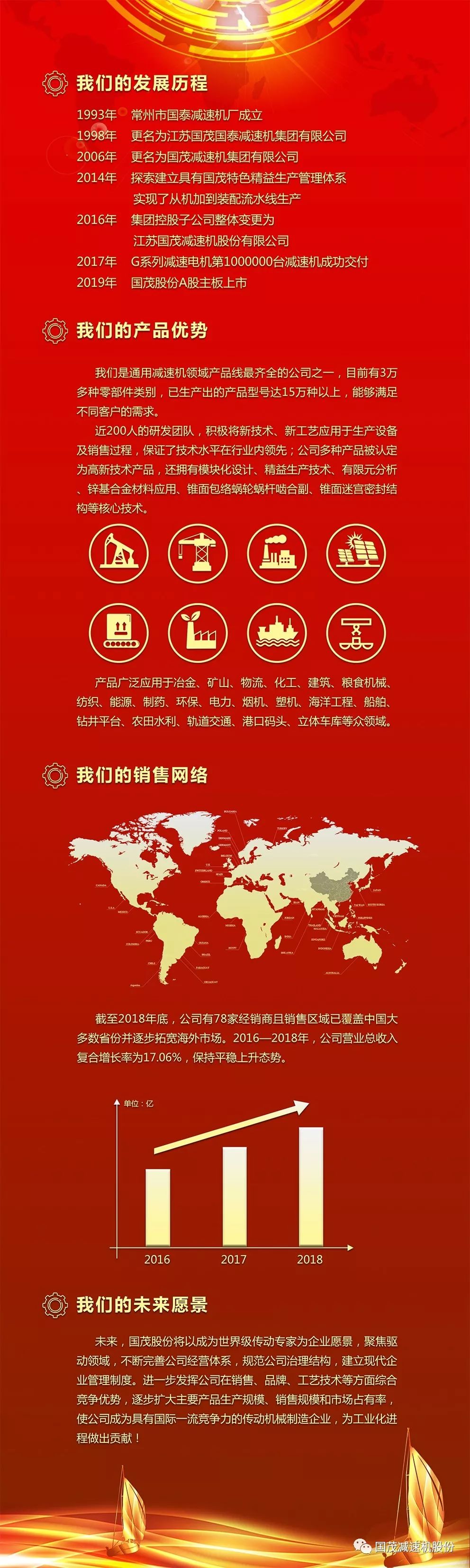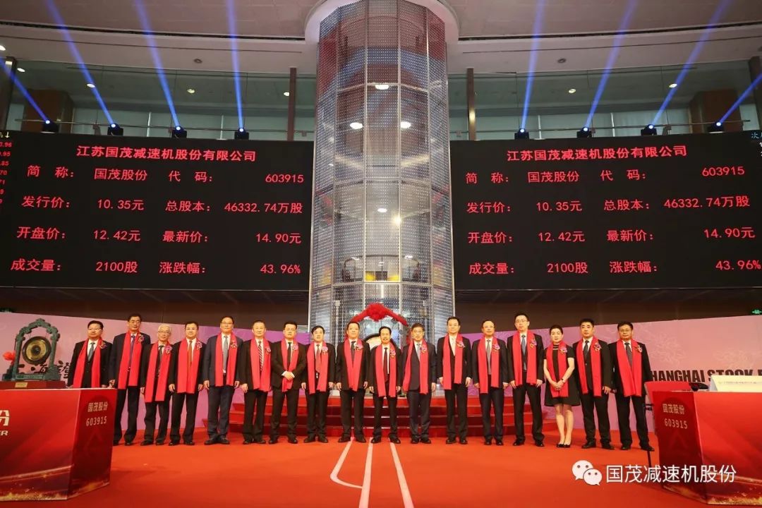 2019年6月14日上午9點(diǎn)30分,江蘇國(guó)茂減速機(jī)股份有限公司上市儀式于上海證券交易所舉行,宣告江蘇國(guó)茂減速機(jī)股份有限公司正式上市,股票簡(jiǎn)稱為“國(guó)茂股份”,股票代碼為“603915”。這是國(guó)茂股份一個(gè)值得記載的歷史時(shí)刻,這也是一個(gè)新起點(diǎn),國(guó)茂股份風(fēng)帆高揚(yáng)、破冰踏浪,開(kāi)啟登陸資本市場(chǎng)的新征程!